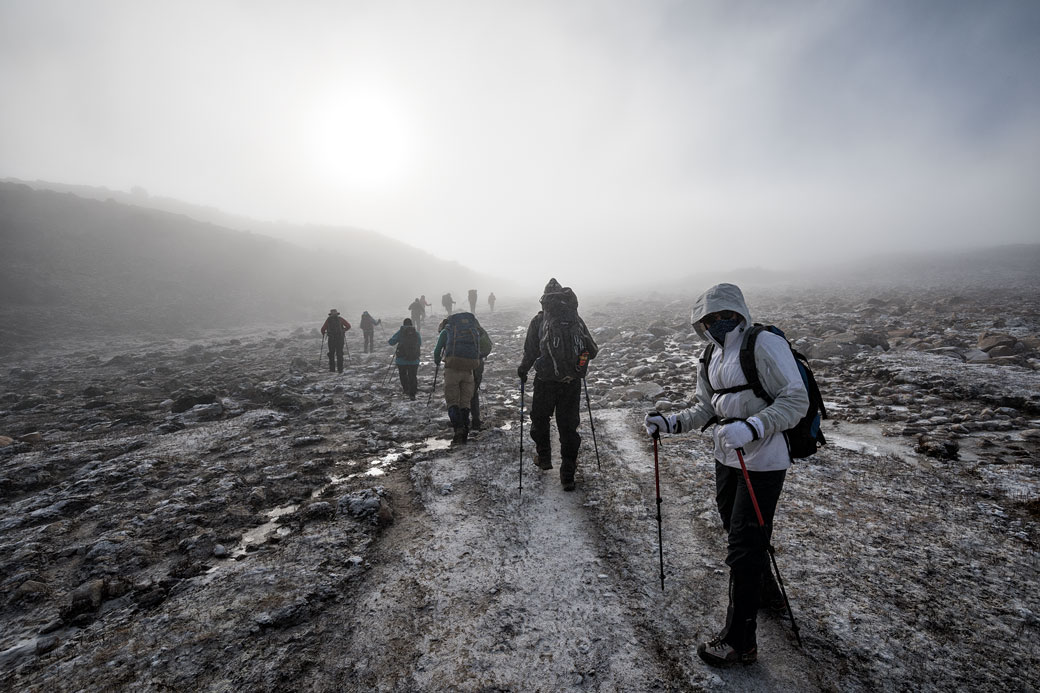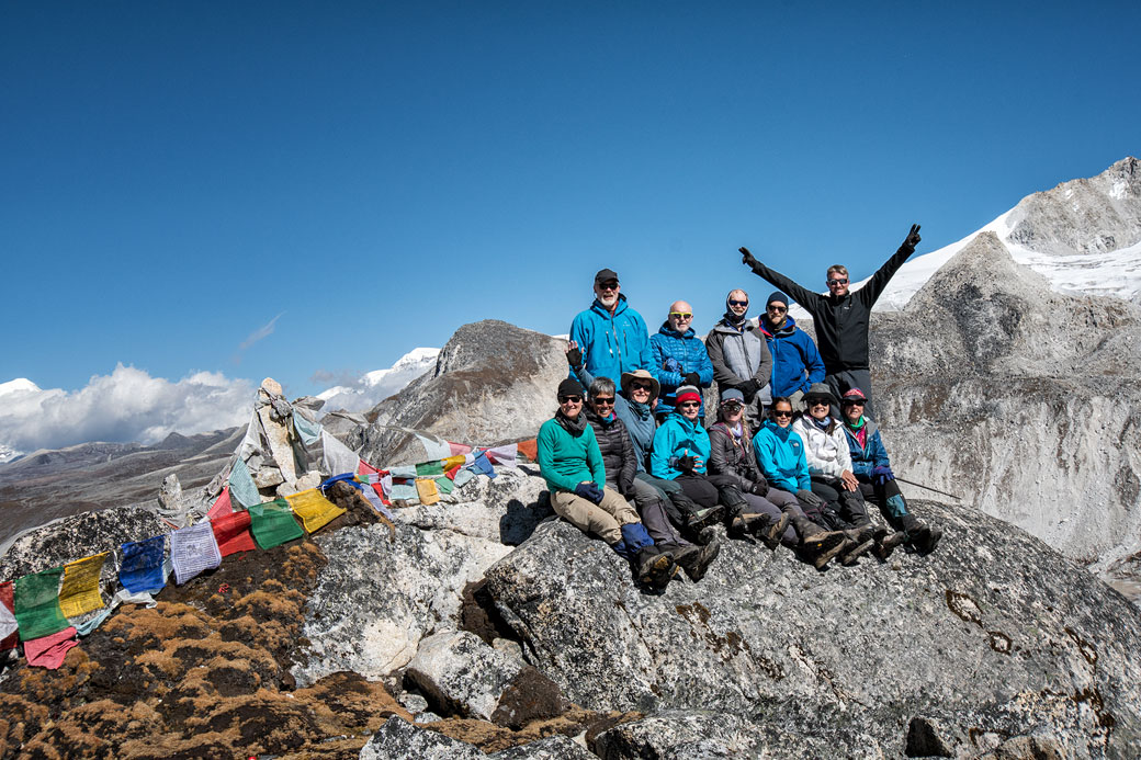 Nous quittons le camp vers 7h20 et le brouillard remonte la vallée à toute vitesse. Parti avec un magnifique soleil, nous marchons maintenant dans la brume en direction du dixième et plus haut col du Snowman Trek, le Rinchen Zoe La, qui culmine officiellement à 5326 mètres d’altitude. L’ambiance est surréaliste. Heureusement le brouillard disparaît en 10 minutes, place à une tempête de ciel bleu pour toute la journée !