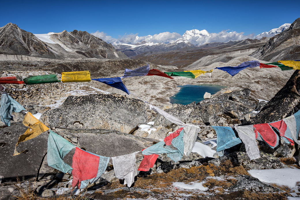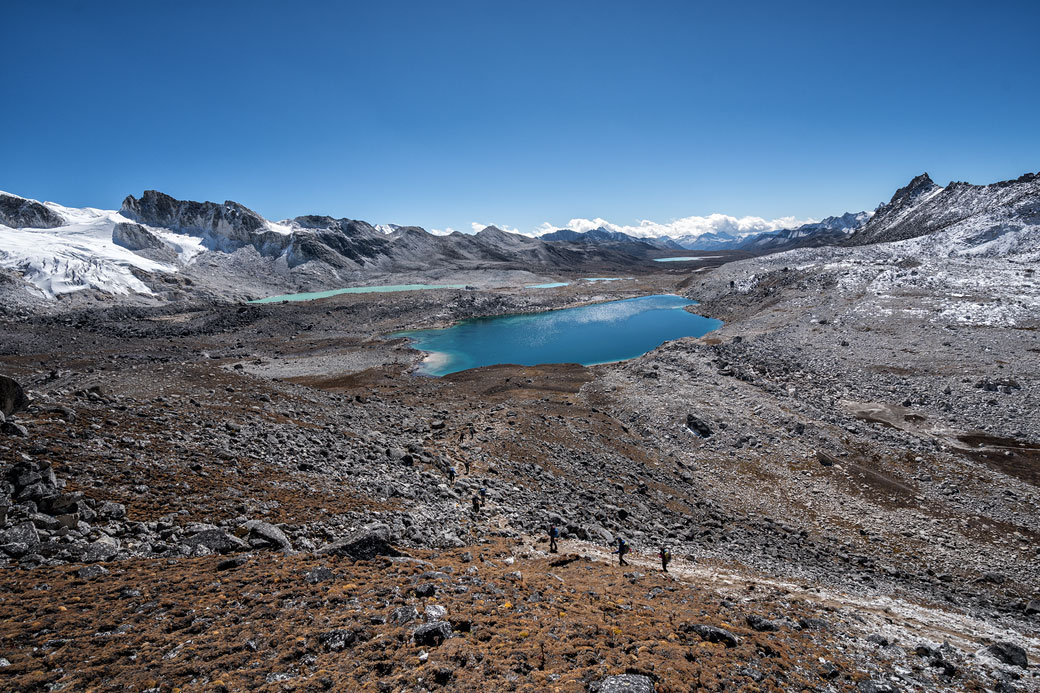 La montée est parfois assez raide, mais pas très longue, après 1h20, mes pieds foulent déjà le Rinchen Zoe La, un superbe col ambiance haute montagne. Sommets enneigés, glaciers qui alimentent des lacs aux couleurs diverses composent ce tableau splendide.