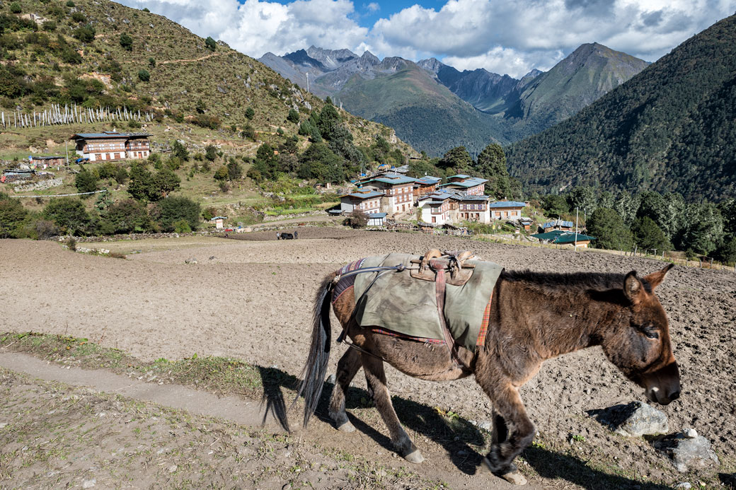 L’étape du jour n’est pas très difficile, elle consiste à rejoindre le village reculé de Laya, le plus grand traversé pendant ce trek. Il y a environ 1000 personnes qui y vivent, principalement des éleveurs de yaks. Le parcours se déroule principalement en descente le long d’une belle vallée très verte sous un soleil de plomb. Il fait chaud, même à 3800 mètres d’altitude, les shorts et t-shirts sont de sortie.