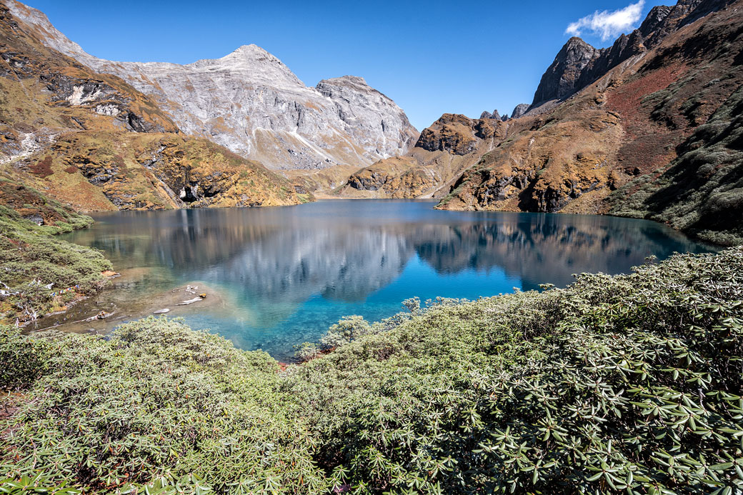 La descente est plutôt raide au début mais nous voilà déjà au bord d’un premier magnifique petit lac, Om Tsho. La déclivité du terrain redevient prononcée avant d’atteindre un deuxième lac, plus petit. Nous retrouvons la forêt un peu plus bas, dans la vallée.