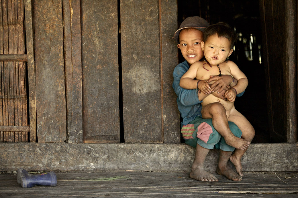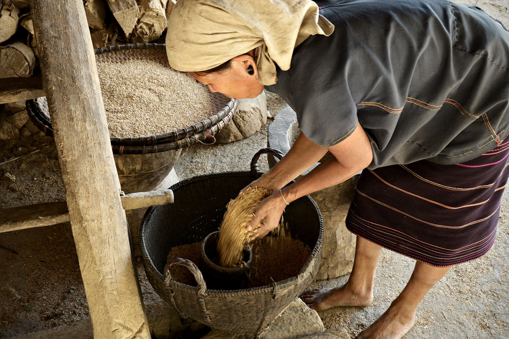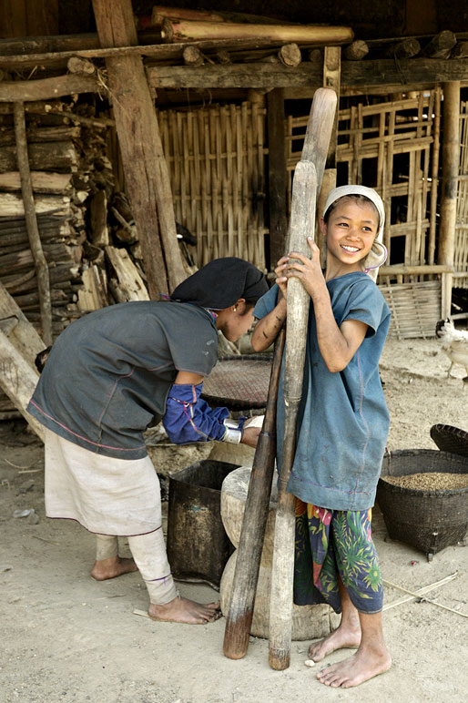 Les femmes frappent des graines et les hommes s’occupent de diverses tâches comme le séchage des feuilles de thé ou du coupage du bambou. Des poules, des cochons et du bétail se trouvent en dessous de leurs grandes maisons. Certains hommes possèdent de curieux tatouages, certains fument, les enfants jouent… Il y a très peu de touristes qui visitent ce village reculé et les rapports humains ne sont pas faussés par l’argent. Il n’y a rien à vendre, pas d’artisanat. Juste des femmes, des hommes et des enfants curieux des étrangers. Nous discutons et partageons le thé avec les villageois avant de prendre congé.