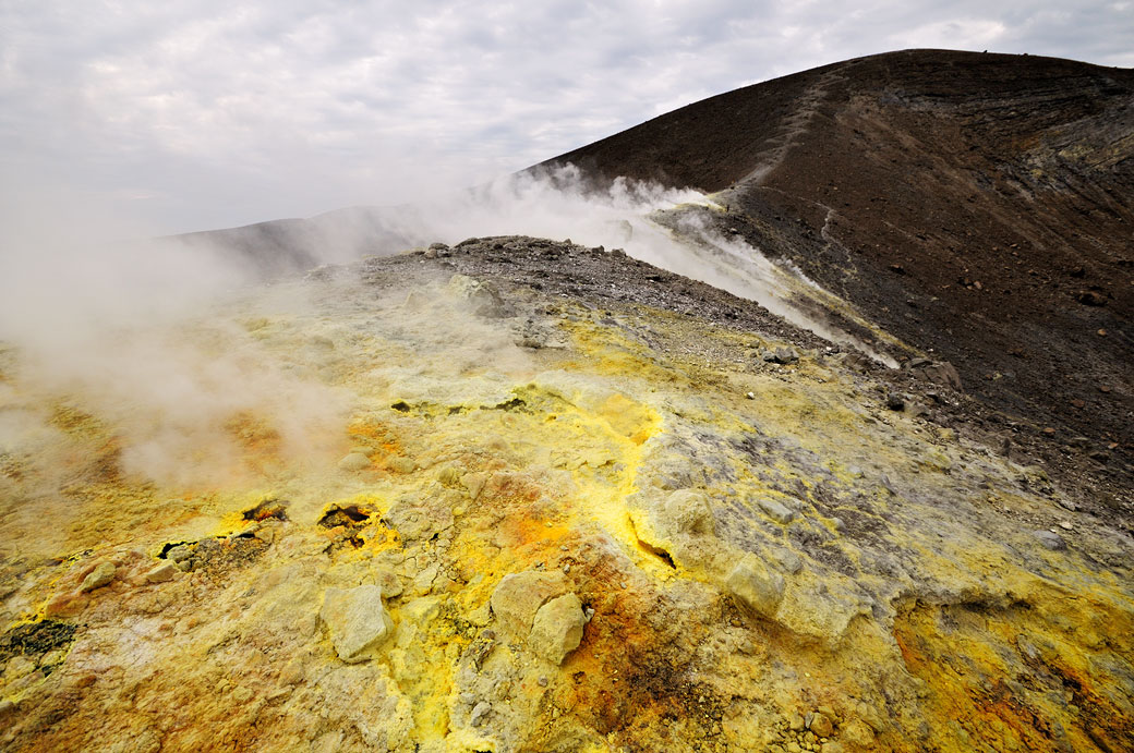 Après cette petite mise en jambe, je pars pour l’ascension au Gran Cratere ou Fossa Grande, le cratère actif de l’île. Il faut environ une heure depuis le port pour atteindre le sommet. En arrivant sur les lèvres du cratère, on trouve sur la gauche les plus importantes fumerolles. Attention aux vents qui peuvent changer de direction et amener les gaz dans ta direction. L’air devient alors irrespirable, les yeux et la gorge piquent. Le soufre en surface forme de splendides dessins allant du jaune profond à l’orange vif, un spectacle fabuleux. C’est un véritable petit Kawah Ijen (célèbre volcan d’Indonésie) en Europe 🙂