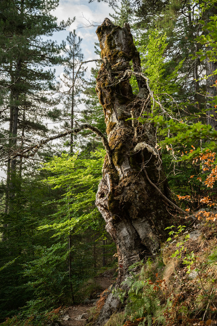 Gros tronc dans la forêt lors de la 11e étape du GR20 entre E Capanelle et Prati