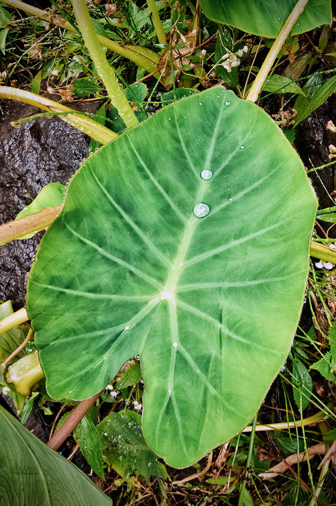 Feuille de Songe (Colocasia Esculenta) sous la pluie, 6e étape du GR R2 entre Roche Plate et Marla