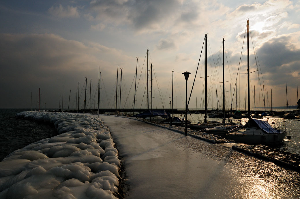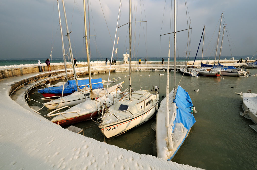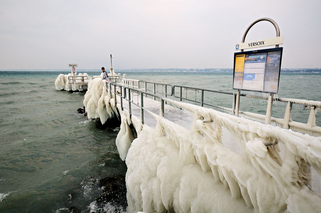 La bise tempétueuse (vent froid et sec du Nord, Nord-Est) associé aux températures Sibériennes avait transformé les berges du lac Léman en un show glacé. Un spectacle beau et inquiétant à la fois…