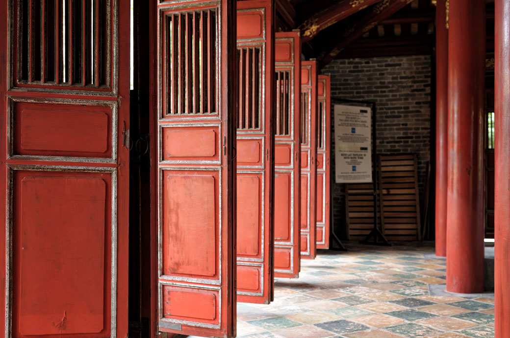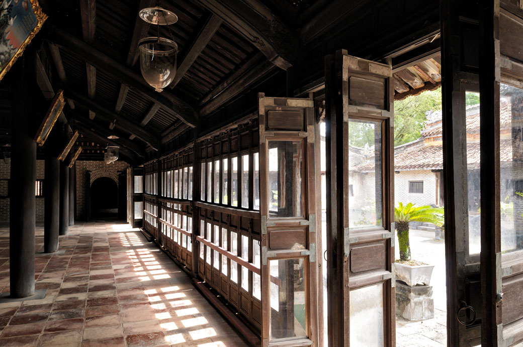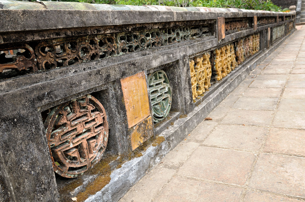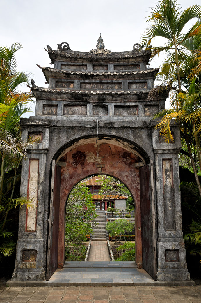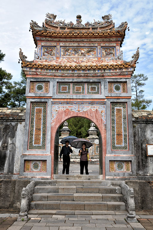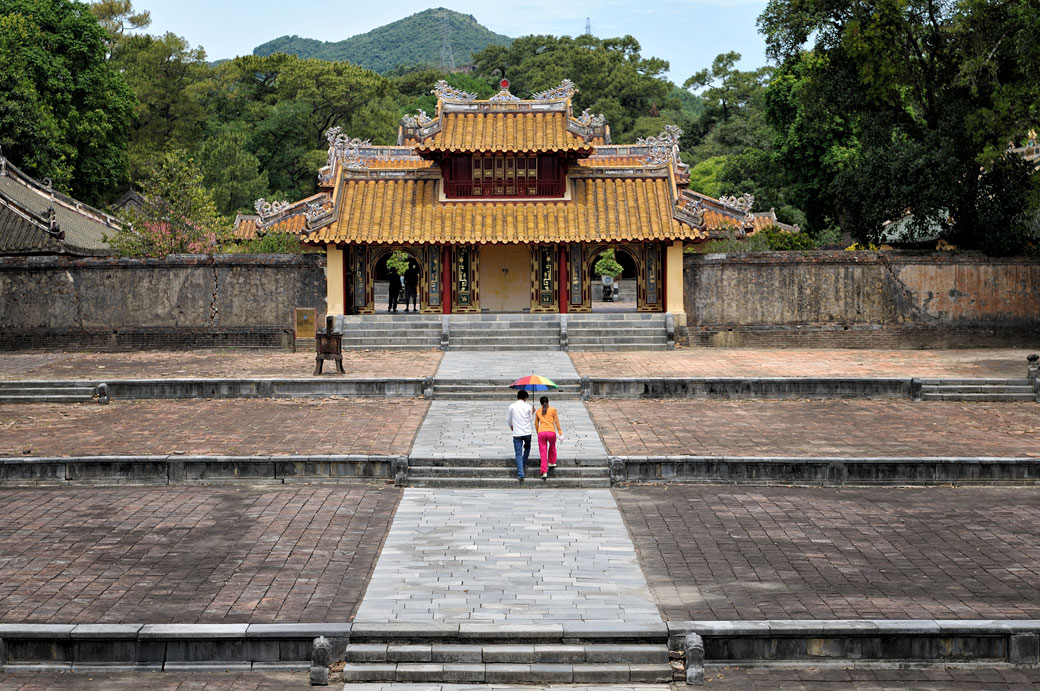 Les divers pavillons et temples sont construits symétriquement sur un axe d’environ 700 mètres de long. La triple porte Hien Duc marque l’entrée dans la zone rituelle où se trouve le temple Sung An où était vénéré Minh Mang.